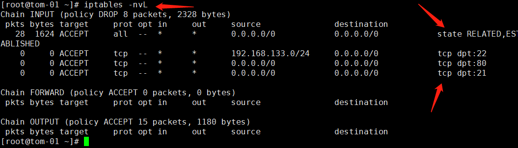 - 以上两条命令是 目标端口为 80 或者 21 的数据包都可以通过