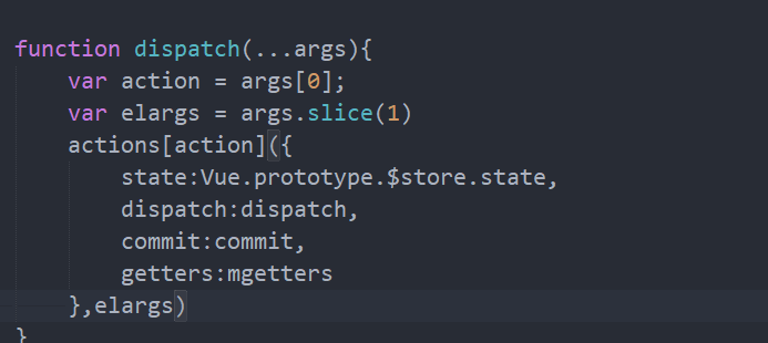 跟commit一样先获取对应的参数,参数基本一样,只是接受的action函数名称,然后调用action,action的内部接受一个context对象,及其他参数,这个context对象集成我们声明的所以函数,我们全部传入即可。