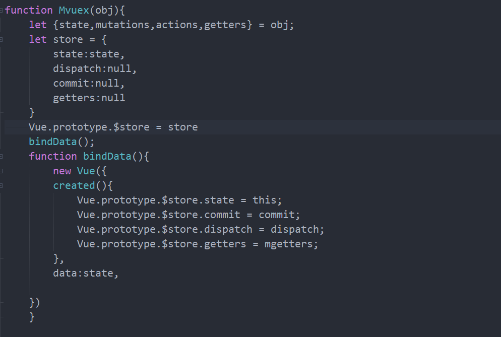 看bindData这个方法,我们直接创建一个vue的实例让后将我们的state绑定到对应的data上,然后把我们对应的方法全部绑定到vue.prototype.$store上,这样我们就把对应方法注册到全局了。