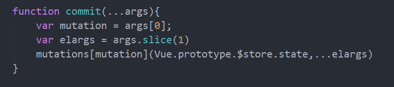 commit接受一个字符串及其其他自定义参数,我们获取到对应的参数,mutation表示对应的mutation函数名称,elargs表示其他参数,那么我们直调用即可。传入对应的state和其他参数即可。这里的state必须是实例内部的data。不然不会响应。