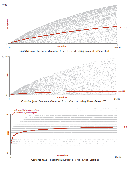 图中横坐标表示插入单词的数量,纵坐标表示插入时的比较次数,灰点表示某次插入的实际比较次数,红点表示平均比较次数(比较总数/插入单词数量),前面学习过基于无序链表和有序数组的实现,平均次数分别为2246和484次,可以看到二叉查找树无论在单词比较次数还是平均次数方面,都有了跨越数量级的进步。