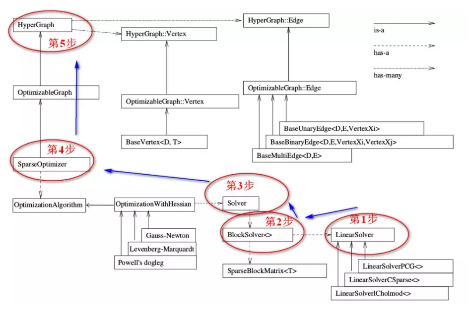 SparseOptimizer是整个图的核心,我们注意右上角的 is-a 实心箭头,这个SparseOptimizer它是一个Optimizable Graph,从而也是一个超图(HyperGraph)