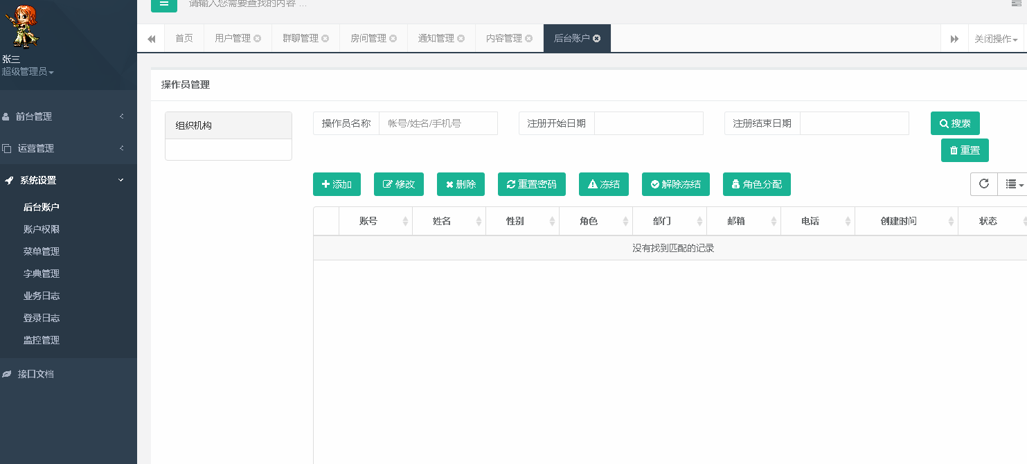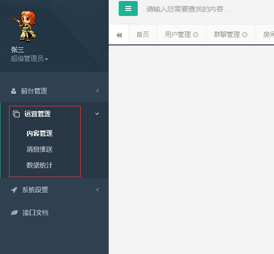 二、 前台管理模块:管理核心功能,包括用户,群组,聊天室的增删改查,