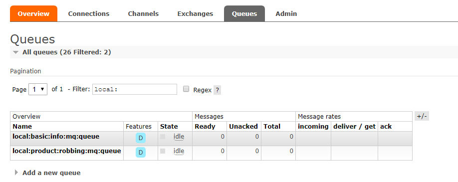 3、当我们在上面创建好队列、交换机、路由及其绑定后,我们可以先把整个项目跑起来,然后打开http://localhost:15672/ 访问RabbitMQ后端控制台,点击 Queues、Exchanges 栏目,即可看到我们创建好的队列、交换机。如下所示