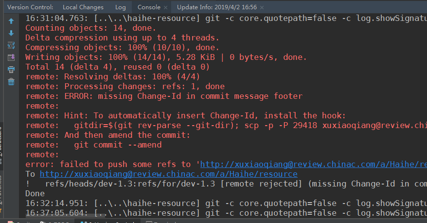 然后尝试提交代码,发现被拒绝,在确认有权限的情况下,看了终端,报错缺少Change-Id