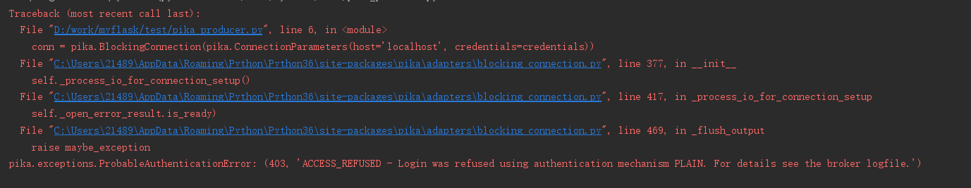 credentials = pika.PlainCredentials('test', '123') # 确认证书的创建为服务端存在的用户名和密码
