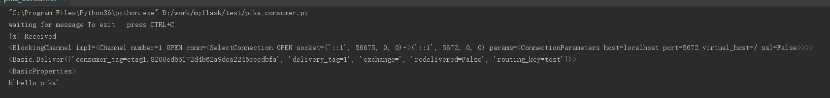 import pika  # 证书创建 credentials = pika.PlainCredentials('test', '123') # 本地连接 conn = pika.BlockingConnection(pika.ConnectionParameters(host="localhost", credentials=credentials)) # 远程连接 # connection = pika.BlockingConnection(pika.ConnectionParameters( # '192.168.56.19',5672,'/',credentials)) channel = conn.channel()  # 再次创建队列,防止队列不存在的情况出现,和生产者队列同名 channel.queue_declare(queue='test')   # 回调函数,用于队列任务结束后的回调,用于将数据返回发送端,表明是否执行完毕 def callback(ch, method, properties, body): print("[x] Received ") print(ch) print(method) print(properties) print(body)   # no_ack 表名是否告知发送端是否接受消息,True - 接收 channel.basic_consume(callback, queue="test", no_ack=True)  # 开启监听,进程夯住,等待消息 print('waiting for message To exit press CTRL+C') channel.start_consuming()