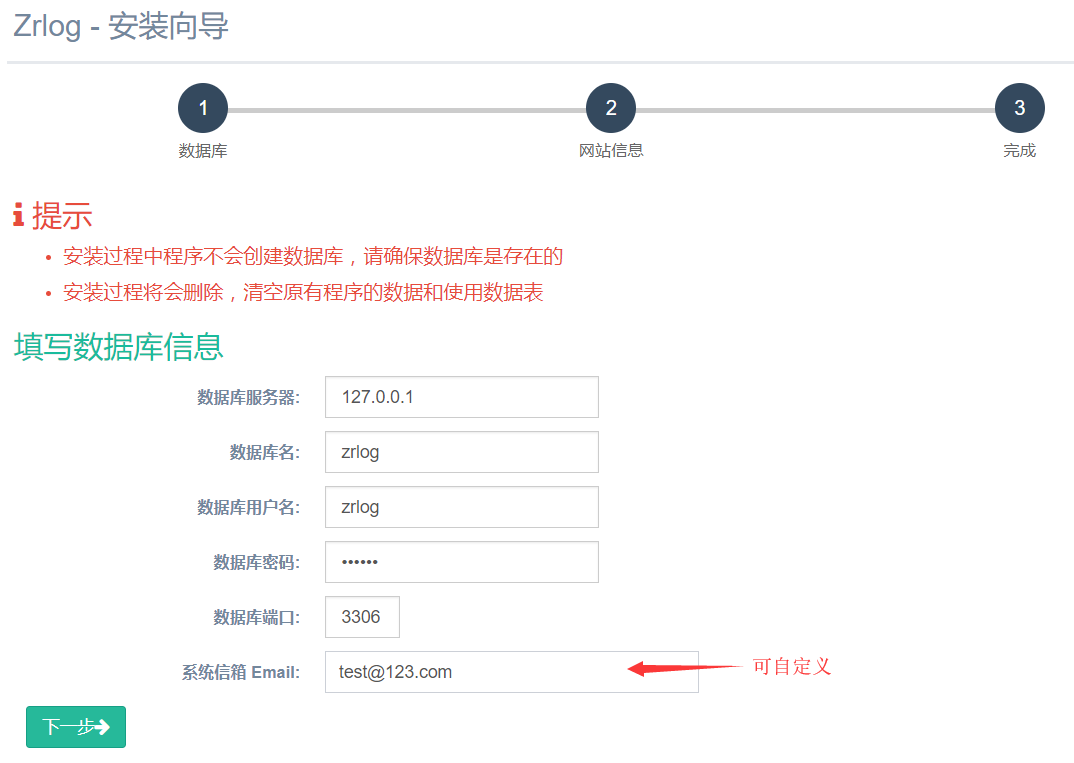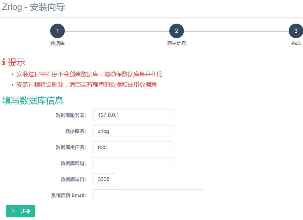 访问后会弹出安装向导,填写数据库相关信息,zrlog不会自动创建,因此在安装之前我们需要创建相应的数据库与用户。