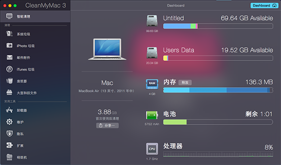 界面的右上角有一个Dashboard按钮,这个仪盘表提供了关于内存空间、磁盘容量、电池使用量、CPU处理器的消耗情况等重要信息,并且在这个界面我们可以快速释放内存,能让我们更充分的利用好内存空间。