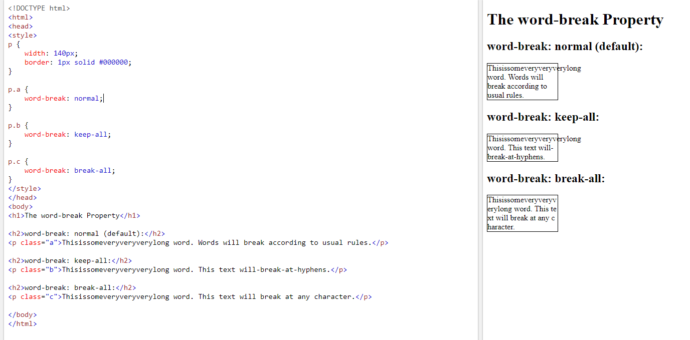 | keep-all | Word breaks should not be used for Chinese/Japanese/Korean (CJK) text. Non-CJK text behavior is the same as value "normal" |
