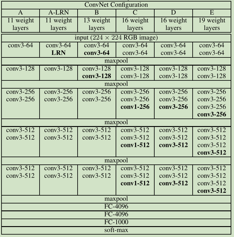 表一:卷积网络配置(按列展示)。从左A到右E配置的深度是逐渐加深的