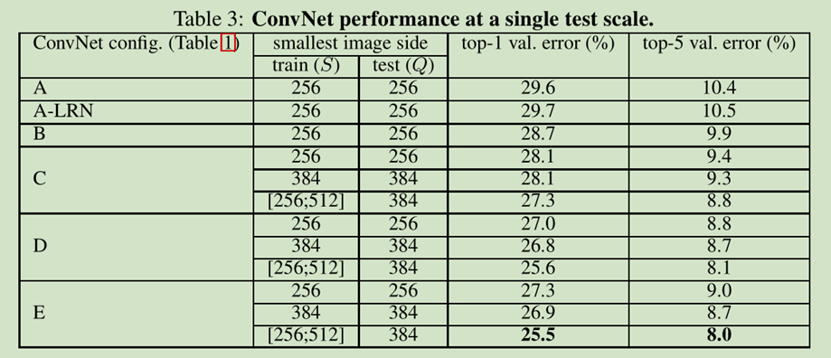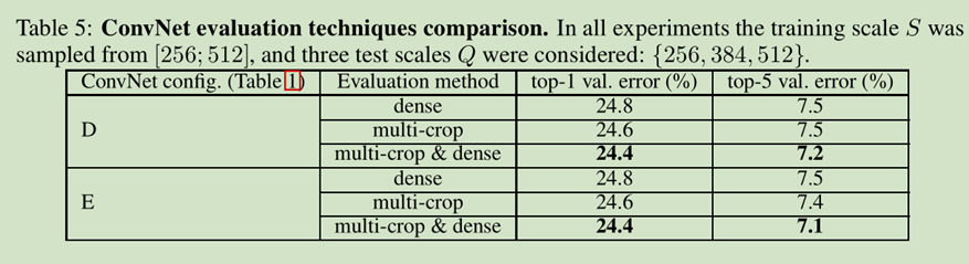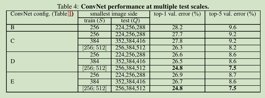 最终,在训练时候尺寸缩放导致比在有固定尺寸的图片(S=256 or S=384)性能好很多,即使一个scale使用在测试时候,测试结果也要高一些。这个就确认了,训练集通过scale缩小增强确实有用。