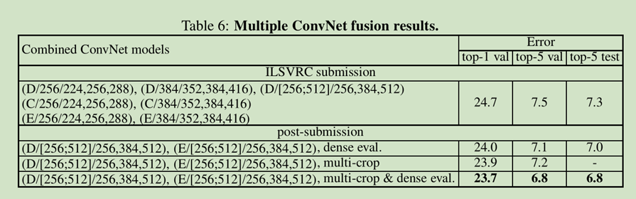 结果在表6中展示了。截至ILSVRC提交的时候,我们只训练单scale的网络和一个多scale的模型D(只是微调了全连接层而不是所有层)。7个网络的全体结果有7.3%的ILSVRC的测试误差。在提交之后,我们考虑了一种只有两个最好的多scale模型的组合(就是D和E),将测试误差减小到7%(使用密度验证)和6.8%(密度和多crop验证)。为了以供参考,我们的最好的单模型结构达到了7.1%的错误率(模型E,表5)。
