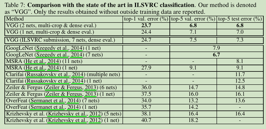 我们可以从表7中看到,我们very deep ConvNets 很明显的比前面几代的模型好。他在ILSVRC-2012和2013中取得了最好的成绩。我们的网络和分类任务的冠军模型GoogleNet相比也是相差不多的,比ILSVRC-2013的Clarifai要好很多。可以认为我们最好的结果是通过结合两个最好的结果才能比几乎大多数的ILSVRC的提交作品更好。相对于单网络性能,我们的结构获得了最好的成绩(7.0%的测试误差),比GooleNet好0.9%。值得注意的是我们没有分离LeCun的结构,而是随着深度的提高,性能变得更好。