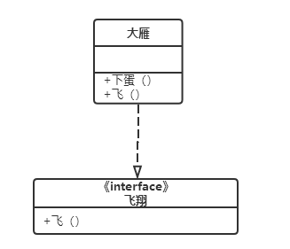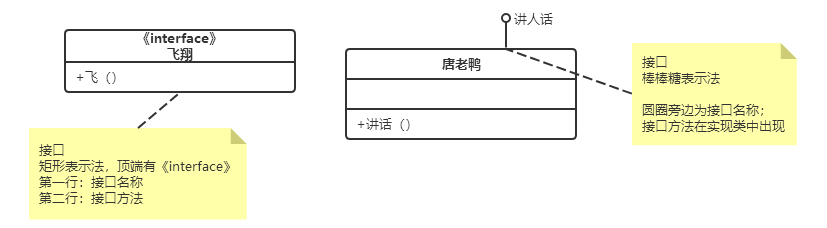 然后注意左下角的‘ 飞翔’,它表示一个接口图,与类图的区别主要是顶端有《interface》显示。第一行是接口名称,第二行是接口方法。接口还有另种表示方法,俗称棒棒糖表示法,就是唐老鸭类实现了‘讲人话’的接口。