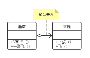 我们再来看大雁与雁群这两个类,大雁是群居动物,每只大雁都是属于一个雁群,一个雁群可以有多只大雁。所以它们之间就满足聚合(Aggregation) 关系。聚合表示一种弱的‘拥有’关系,体现的是A对象可以包含B对象,但B对象不是A对象的一部分。聚合关系用 空心的菱形 + 实线箭头 来表示。”
