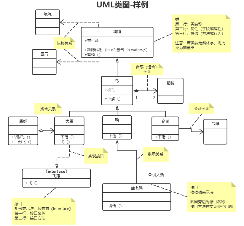 首先看那个‘动物’矩形框,它就代表一个类(Class)。 类图分三层,第一层显示类的名称,如果是抽象类,则就用斜体显示。第二层是类的特性,通常就是字段和属性。第三层是类的操作,通常是方法或行为。注意前面的符号,‘+' 表示public, '-' 表示private,“#' 表示protected.”