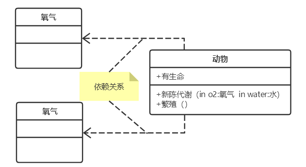 动物几大特征,比如有新陈代谢,能繁殖。而动物要有生命力,需要氧气、水以及食物等。也就是说,动物依赖于氧气和水。他们之间是依赖关系(Dependency),用虚线箭头来表示。