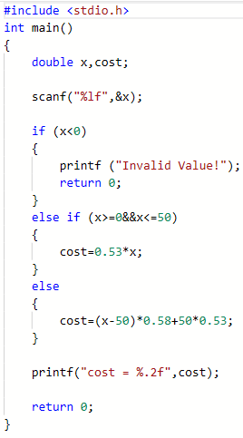 - 数据处理:cost=(x-50)0.58+500.53,if-else语句,分支格式