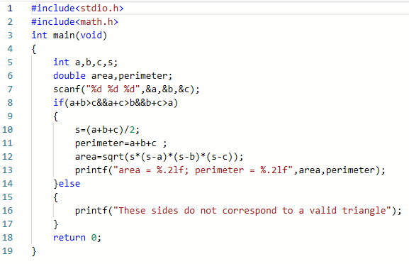 - 数据处理:s=(a+b+c)/2; ,if-else语句,分支格式