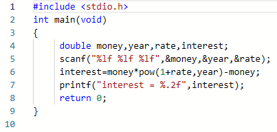 - 数据处理:money*pow(1+rate,year)-money,scanf语句
