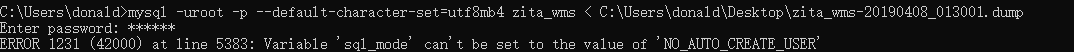 ERROR 1231 (42000) at line 5383: Variable 'sql_mode' can't be set to the value of 'NO_AUTO_CREATE_USER'