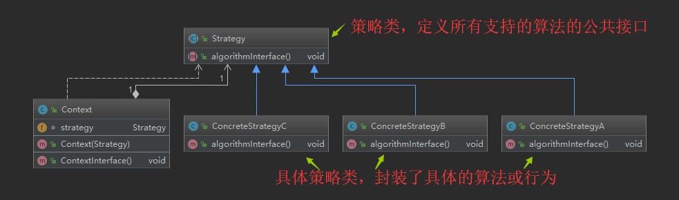 抽象策略角色,是对策略、算法家族的抽象,通常为接口,定义每个策略或算法必须具有的方法和属性。algorithm是“运算法则”的意思。