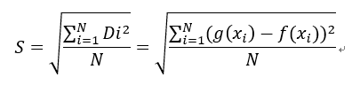 由于预处理机制的存在,我们只需讨论g(x)在[0,π/2]上对f(x)的拟合情况。为了便于数值分析,先将自变量x离散化:把X轴上的大区间[0,π/2]均分为 N=π/2ΔX 个区间,取每个区间的左端点代表整个区间,这样我们便在X轴上获得了 N 个点,每个点坐标为xi。记每个点处偏差为Di = g(xi) - f(xi) ,则标准偏差S表示为: