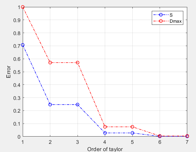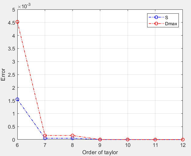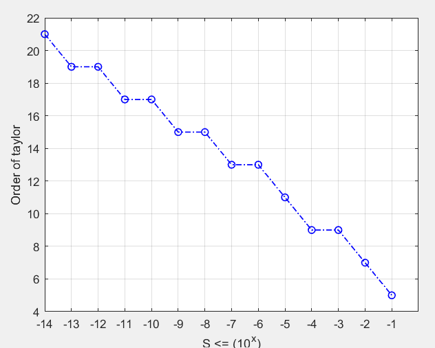 利用上述算法绘制出“S的数量级--Taylor阶数”图。给定最大允许标准偏差,由图可得最小展开阶数。例如要求精度达到1e-14,至少应展开21阶。