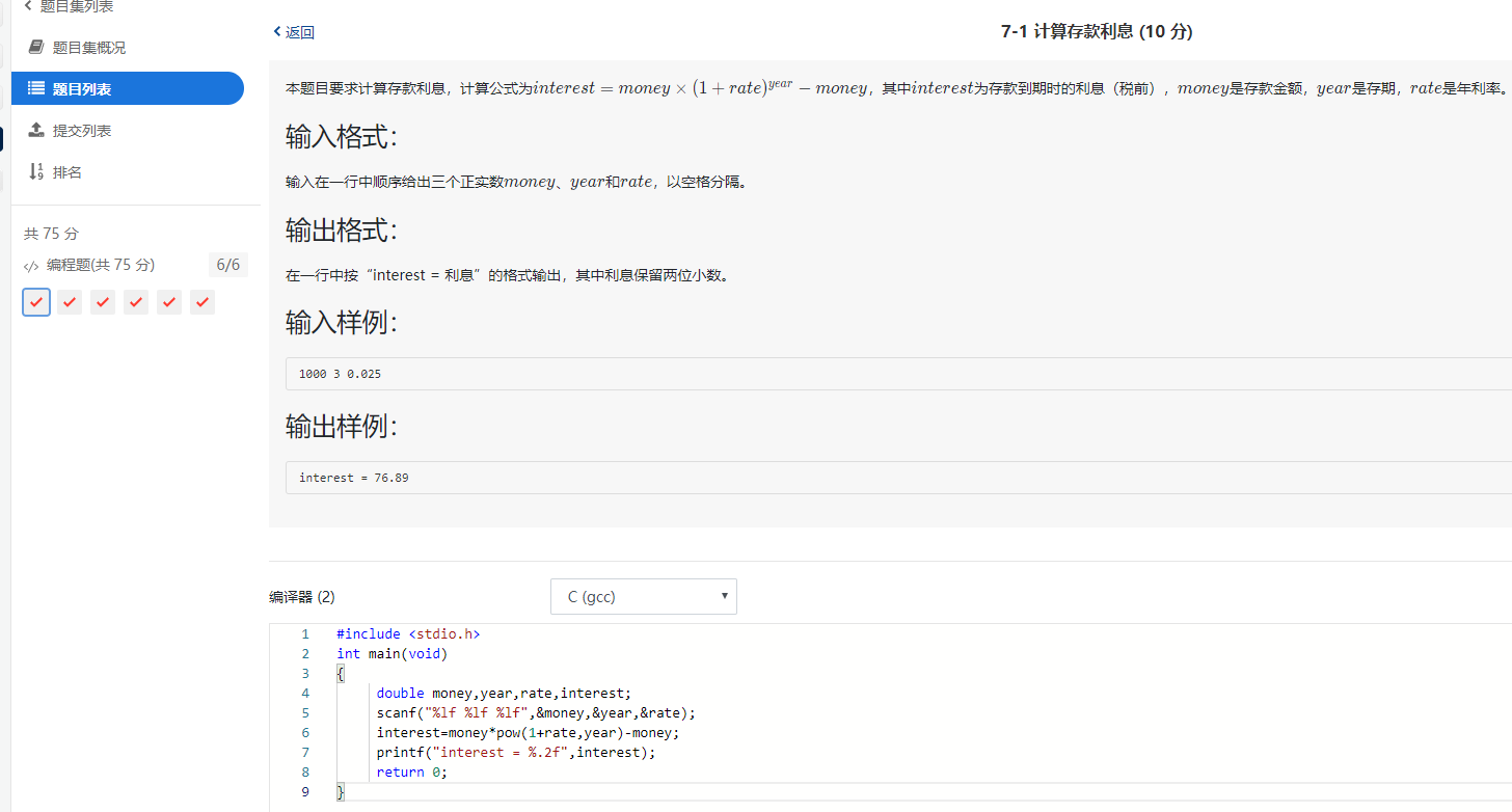本题目要求计算存款利息,计算公式为interest = money * pow((1+rate,year) - money。