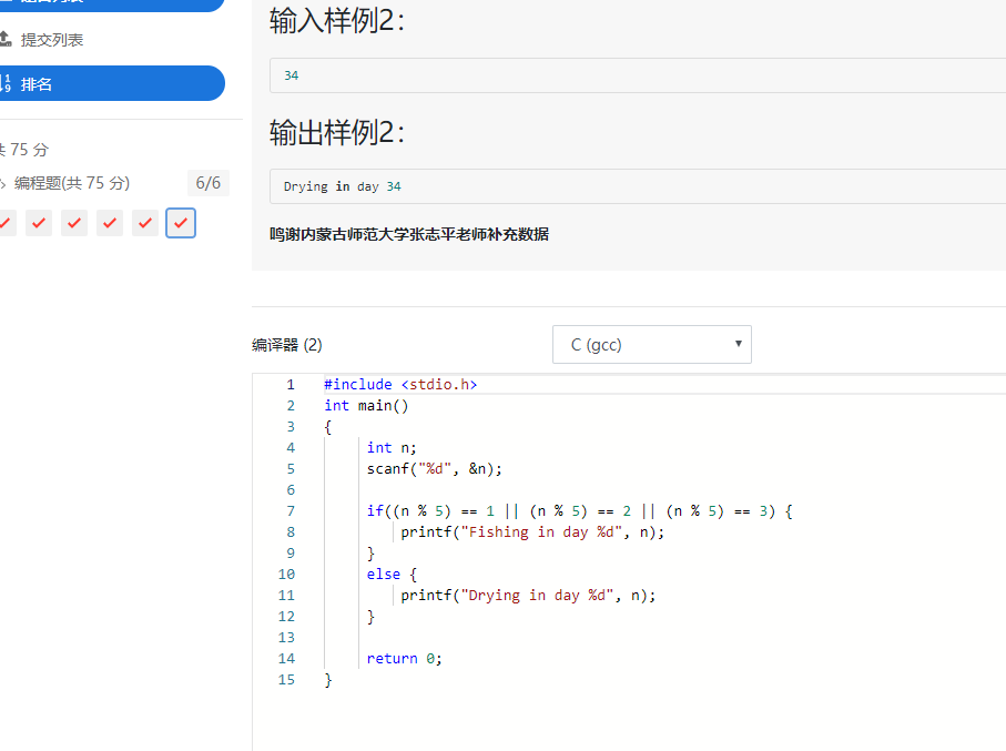 数据处理:在一行中输出此人在第N天中是“Fishing”(即“打鱼”)还是“Drying”(即“晒网”),并且输出“in day N”;2.流程结构:预处理指令-函数部分-声明变量-赋值-输出