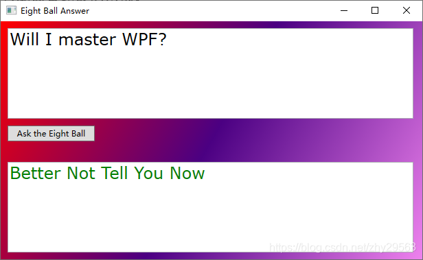 上图中显示的Eight Ball Answer窗口包含4个控件:一个Grid控件、两个TextBox控件和一个Button控件。安排和配置这些控件所需的标记比前面例子中的标记长的多。下面简要列出这些标记,其中一些细节用省略号代替,以便于描述整个结构: