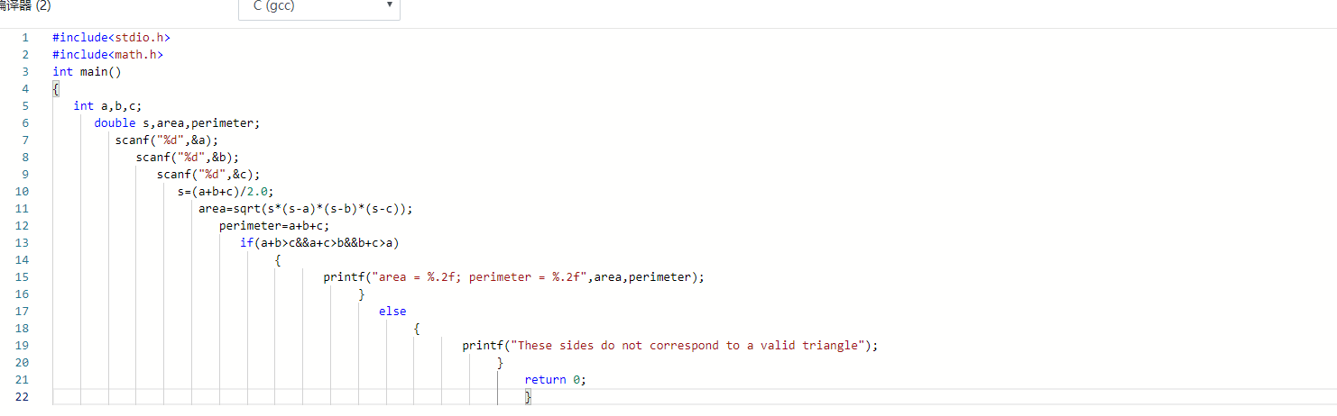 - 数据表达:使用变量a,b,c,s,area,perimeter;a,b,c都是输入的三角形的边长,s是计算面积area的一个变量,其中a,b,c为整形数,s,area,perimeter是双精度浮点数;
