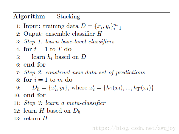 基础模型通常包含不同的学习算法,因此stacking通常是异质集成。算法伪代码如下: