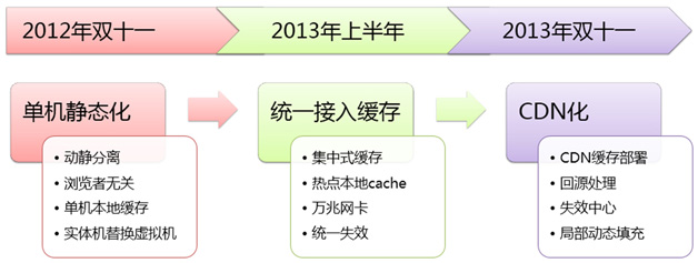 为此,自2011年起,以天猫商品详情系统为代表,天猫浏览型系统在架构上的主要工作之一就是通过静态化技术实现了动静态信息分离、利用缓存技术存放静态化内容、利用少量动态数据异步加载填充。整个过程历经单机静态化、统一缓存接入,到2013年双11前彻底CDN化三个阶段(如图1所示),有效解决了缓存命中率、流量自然分布、系统扩容简化、用户端响应速度等关键问题。