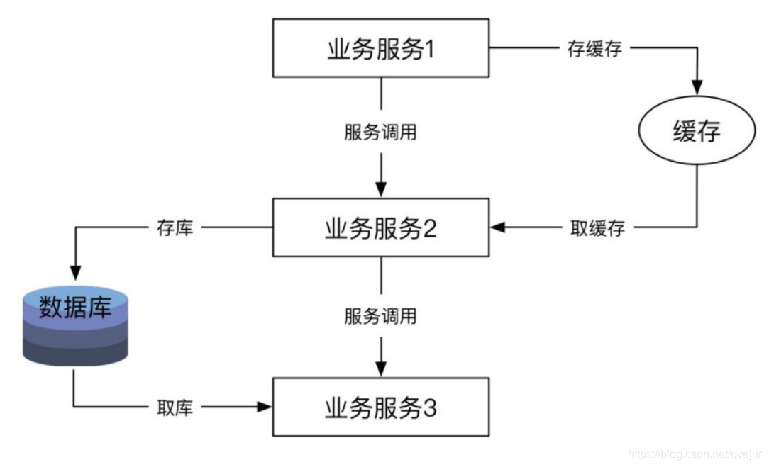 在实践的过程中,有些方案的设计使用缓存或者数据库作为两个微服务之间的纽带,在业务流程的处理过程中,为了处理简单,前一个服务将中间结果存入数据库或者缓存,下一个服务从缓存或者数据库中拿出数据继续处理。处理流程如下图所示。