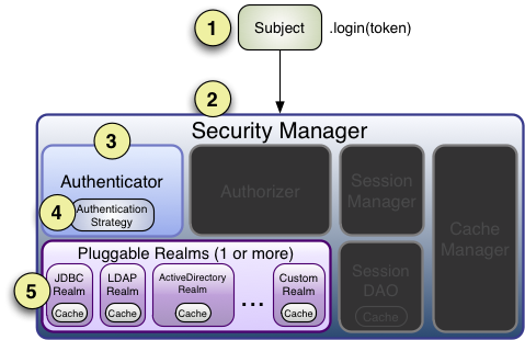 第3步:SecurityManager,基本的“安全伞”组件,得到令牌并通过调用 authenticator.authenticate(token))简单地将其转交它内部的 Authenticator 实例,大部分情况下是一个 ModularRealmAuthenticator 实例,用来支持在验证过程中协调一个或多个Realm实例。