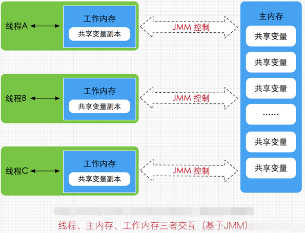 Java内存模型(即Java Memory Model,简称JMM)本身是一种抽象的概念,并不真实存在;每个线程创建时JVM都会为其创建一个工作内存(有些地方称为栈空间),用于存储线程私有的数据,而Java内存模型中规定所有变量都存储在主内存,主内存是共享内存区域,所有线程都可以访问,但线程对变量的操作(读取赋值等)必须在工作内存中进行,首先要将变量从主内存拷贝的自己的工作内存空间,然后对变量进行操作,操作完成后再将变量写回主内存,不能直接操作主内存中的变量;JMM与Java内存区域的划分是不同的概念层次,Java内存模型是围绕着并发编程中原子性、可见性、有序性这三个特征来建立的;