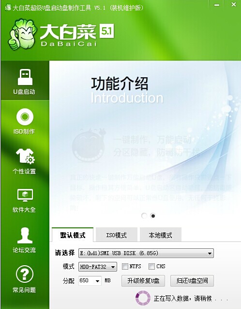 启动应用程序,插入USB盘,大白菜自动识别USB设备,进入如下界面: