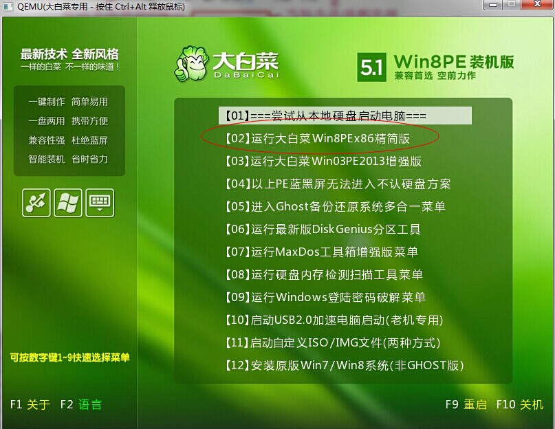 2)U盘启动后,出现图形界面,选择第二项“【02】运行大白菜Win8PEx86精简版”,按Enter键确定。