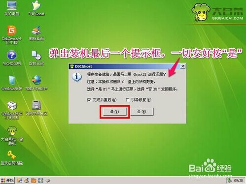 按过确定后,会弹出装机前最后一个警示性提示框,因为装机时,会把要还原的磁盘分区里面所有文件全部删除,请你最后确认是否执行此操作,如果你已经准备好了,按“是”。