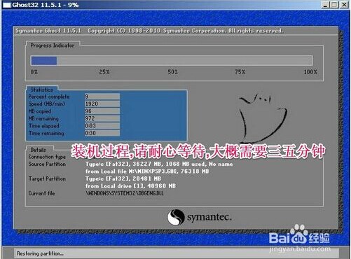 接下来进入Ghost安装画面,等几分钟就可以把系统灌进C盘里了,如下图: