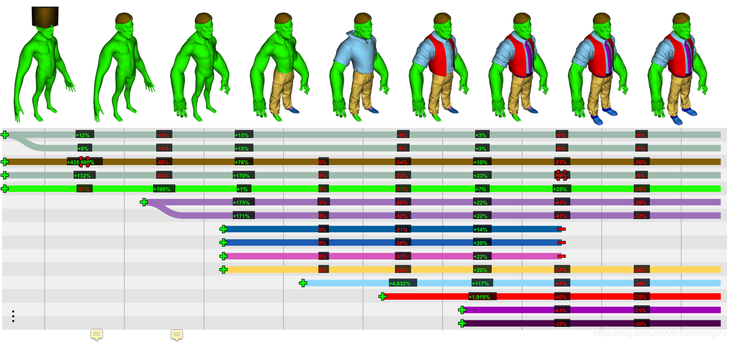 图1:从共有760万个多边形中的真实建模序列的9个关键帧(顶部)中提取并折叠的编辑时间线(底部),。 §5中列出了所检测到的操作的图例,完整的时间表在补充材料中。