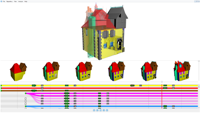 与最近的逆图像编辑[HXM * 13]类似,我们提出了一组简单的几何规则和方法来检测常见的编辑操作并提取语义出处(provenance)。我们通过折叠(合并)无冲突的编辑并删除冗余的模型快照来进一步提供摘要。然后可以将经过分析和抽象的时间轴显示在我们的自定义查看器中,以快速浏览编辑历史记录并关注关键事件。我们在一系列模型上测试了该系统,通常跨越50-100张快照,每个快照包含数千个组件,并恢复了紧凑而翔实的编辑摘要,请参见图8。
