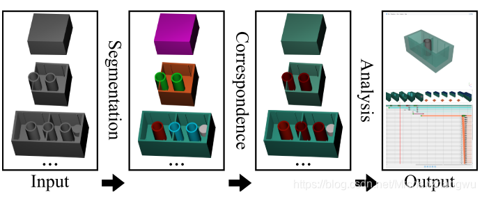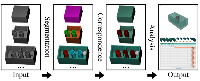 图3 流水线。 已加载连续模型的集合。在预处理步骤中,分别对网格进行分割,并估算基于零件的对应关系。 将对此进行分析,并将隐含的编辑历史记录可视化。