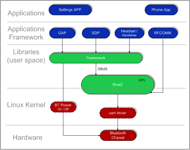 Bluez 是GPL许可的,因此Android的框架内与用户空间的bluez代码通过D-BUS进程通讯进行交互,以避免专有代码。