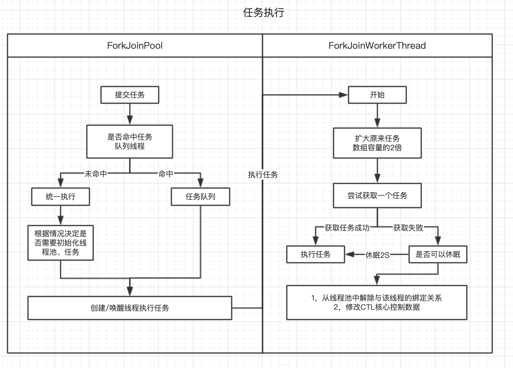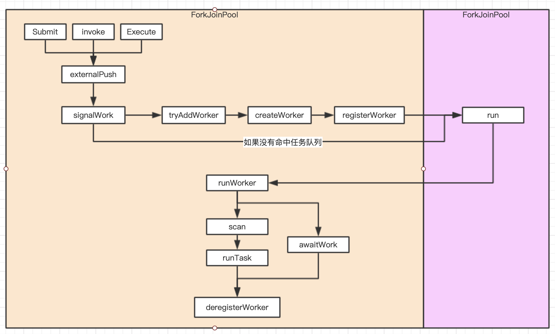 下图为ForkJoinPool的整体执行流程,下文的源码分析会结合该图详细介绍,介绍完毕之后,最后补充具体的方法级别调用图