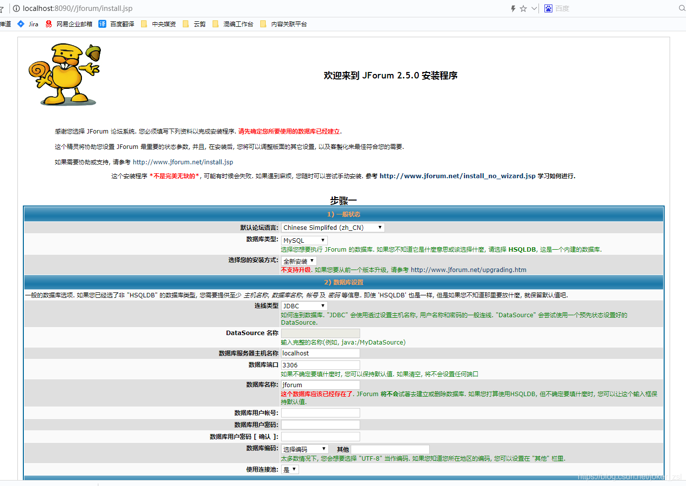 输入网址http://localhost:8090//jforum/install.jsp进入安装向导。(注意Tomcat的端口号,默认8080,这里修改为了8090)