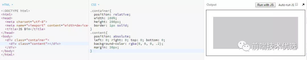 当绝对定位元素的水平方向(left/right)或垂直方向(top/bottom)的两个定位属性同时存在的时候,绝对元素在该方向上便具有了流体特性。此时的width/height属性具有自动撑满的特性,和一个正常流的div元素的width属性别无二致。如图,设置了固定margin值的元素,宽高auto能够自动适应剩余空间: