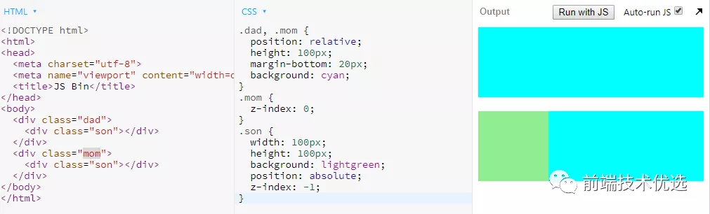 如下图所示.dad元素默认设置z-index: auto,没有创建层叠上下文,此时其就是一个普通的块级盒子,所以设置了z-index: -1的.son元素跑到了爸爸身后看不见了。